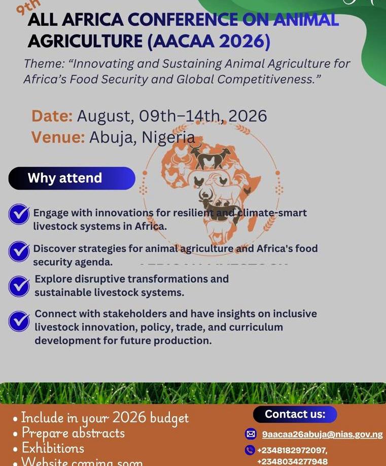 The 9th All Africa Conference of Animal Agriculture (AACAA) will be hosted in Abuja, Nigeria from 11th – 16th October 2026 under the theme: “Innovating and Sustaining Animal Agriculture for Africa’s Food Security and Global Competitiveness.”