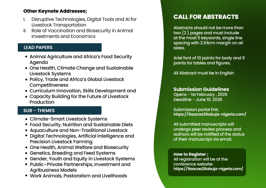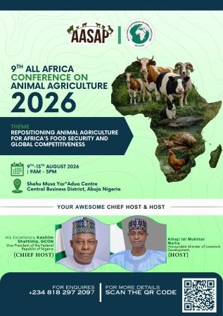 The 9th All Africa Conference of Animal Agriculture (AACAA) will be hosted in Abuja, Nigeria from 09th – 13th August 2026 under the theme: “Innovating and Sustaining Animal Agriculture for Africa’s Food Security and Global Competitiveness.”